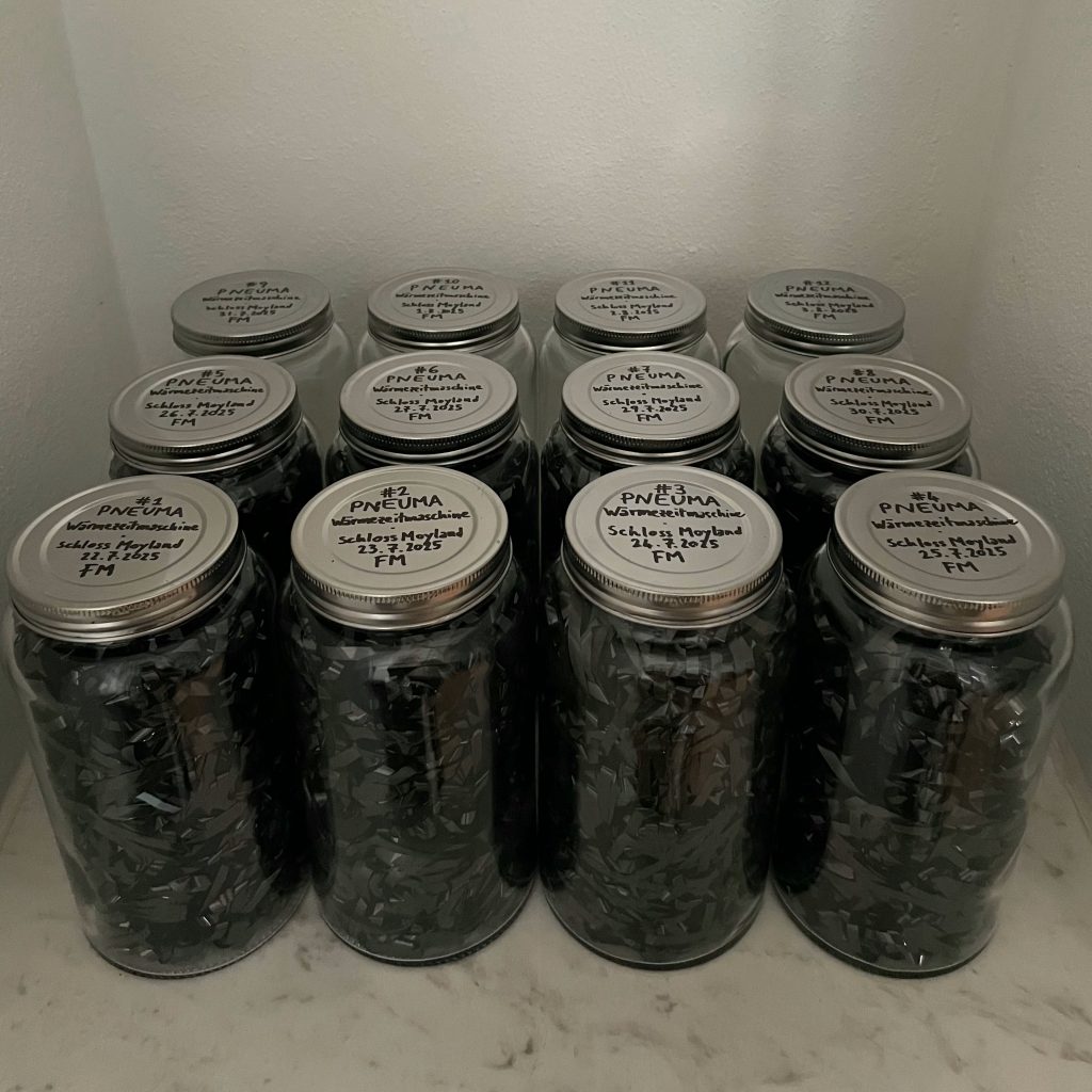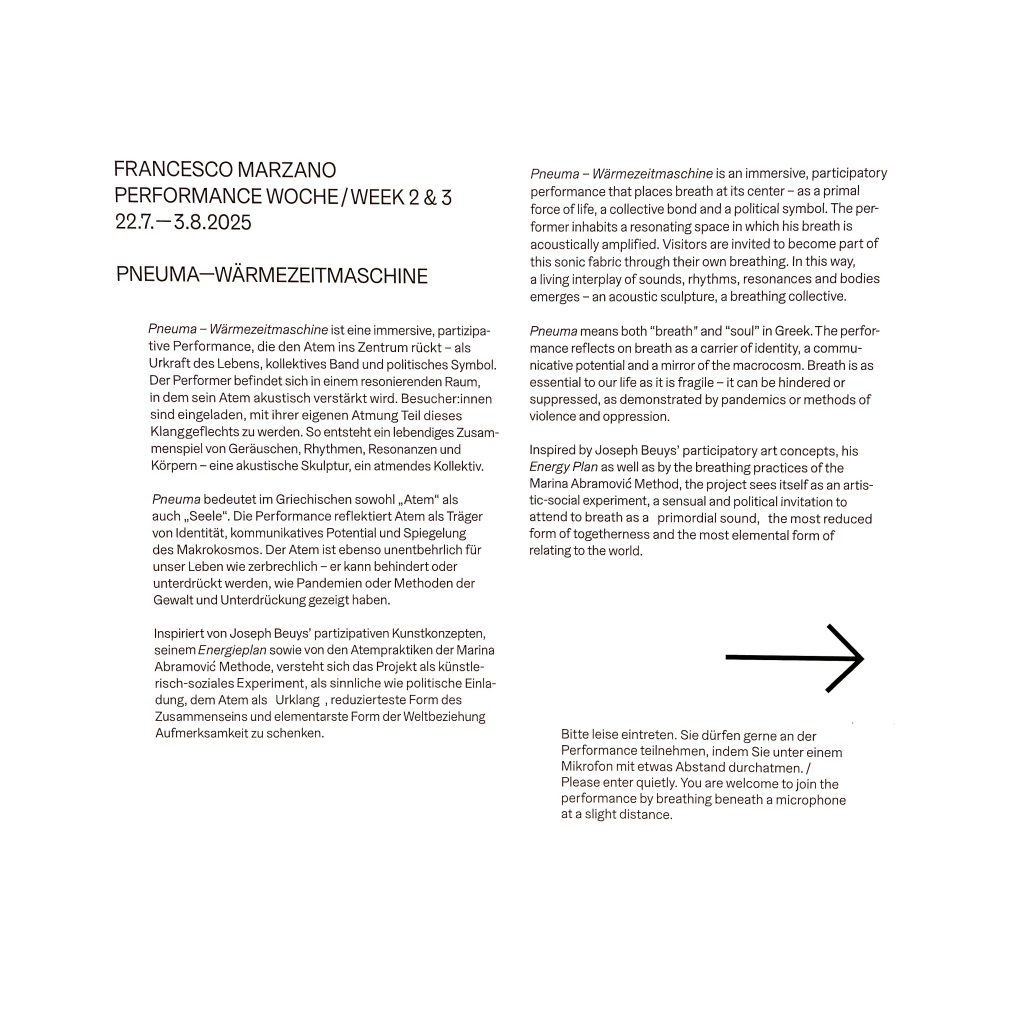 Pneuma – Wärmezeitmaschine is an immersive, participatory performance that places breath at its centre – as a primal force of life, a collective bond, and a political symbol. The performer inhabits a resonating space in which his breath is acoustically amplified. Visitors are invited to become part of this sonic fabric through their own breathing. In this way, a living interplay of sounds, rhythms, resonances and bodies emerges – an acoustic sculpture, a breathing collective.
