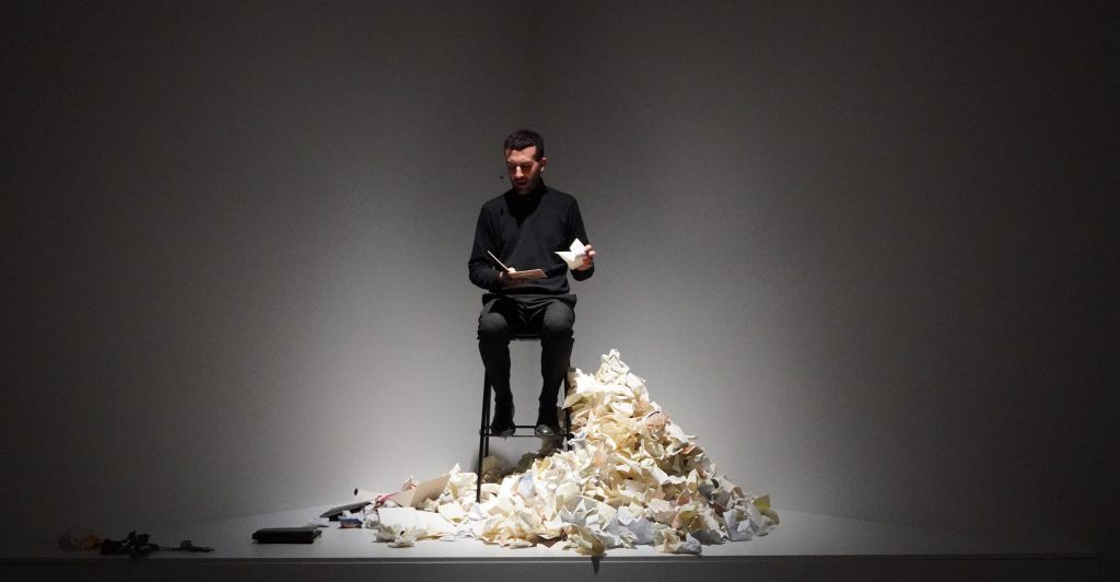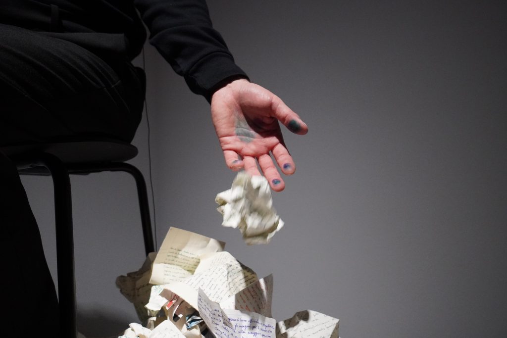 In order to turn the page, I read aloud from my diaries of the last ten years, which I have never reread since writing them. I tear them out and crumple them, page after page. A heap of paper memories grows on the floor around me. These pages hold my most personal desires and fears, but also the mundane scenes of everyday life. They will all be evoked one last time.