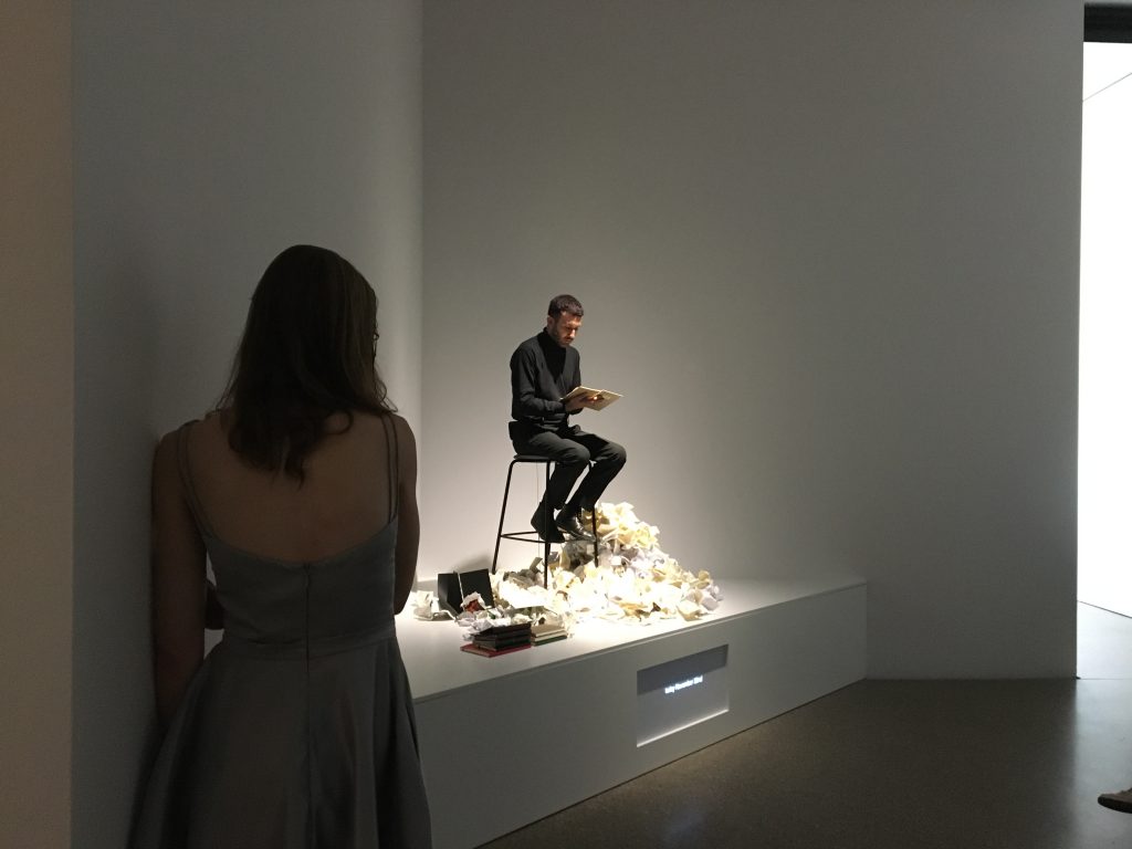 [Handwritten diaries 2013-2023; bar stool; live-translation program; microphone; projector]